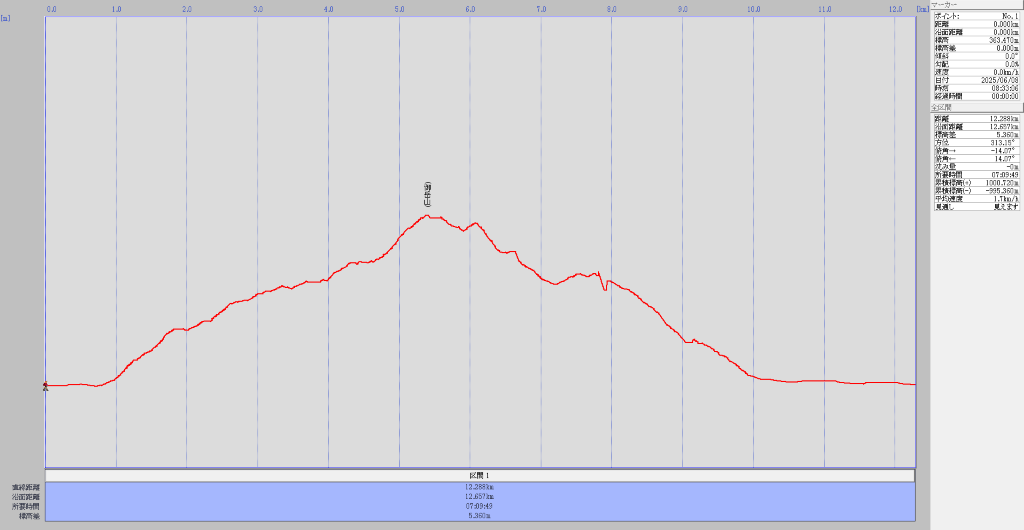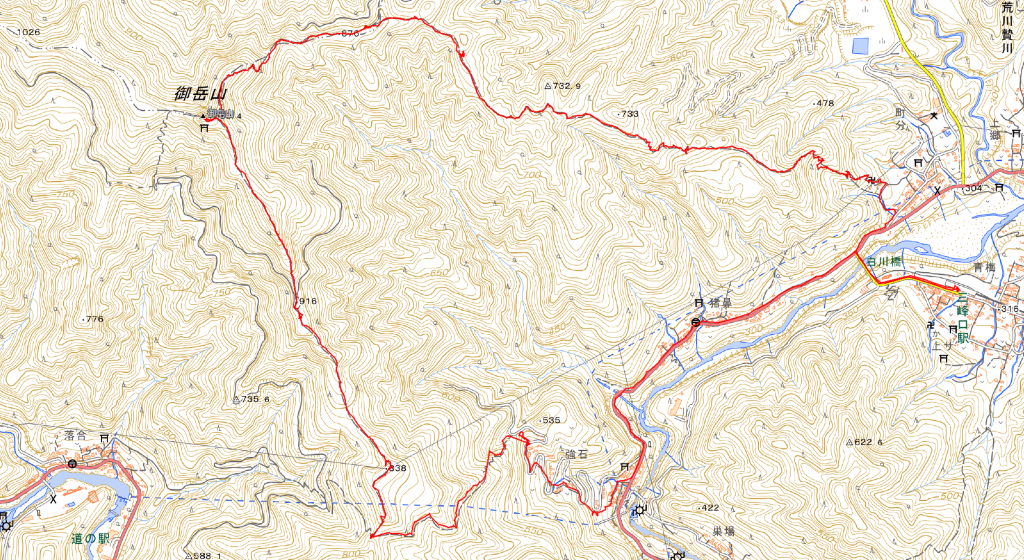 三峰口駅8:33登山口8:49第一高岩9:03~07 610m平坦9:42~47 780m10:33~40タツミチ10:59~11:08秩父御岳山11:47~12:24林道13:02~07鉄塔838m13:37~47杉ノ峠14:00~05舗装路・民家14:42~50強石15:10三峰口駅15:43