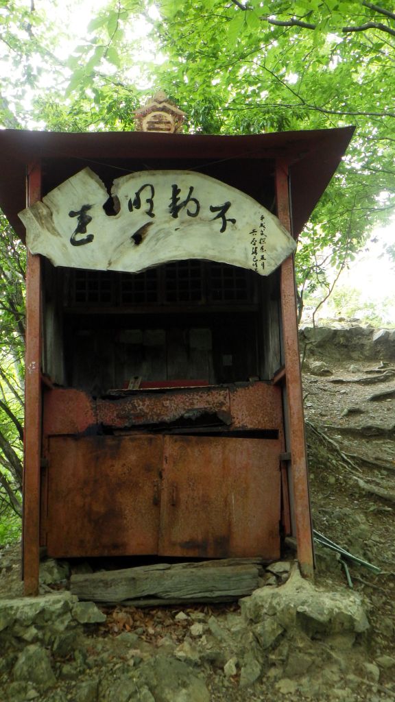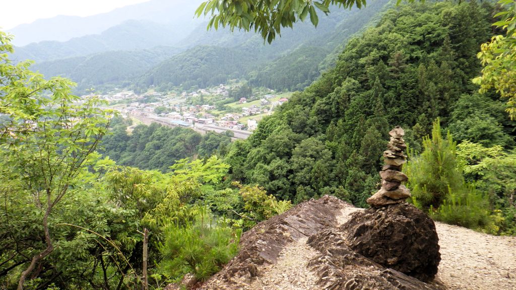 三峯神社行8時発のバスは超満員。バスで通過した白川橋を渡り右折して左に入り真新しい贄川宿の標識、左に入ると登山口。墓地が続く道は初めから急登が続き第一高岩、眼下に三峰口駅が見える。