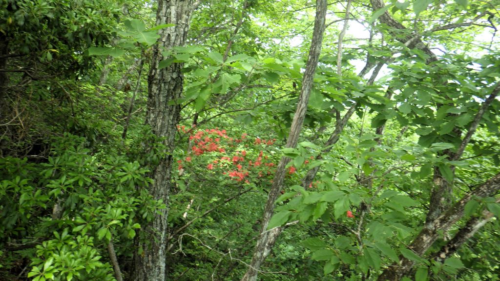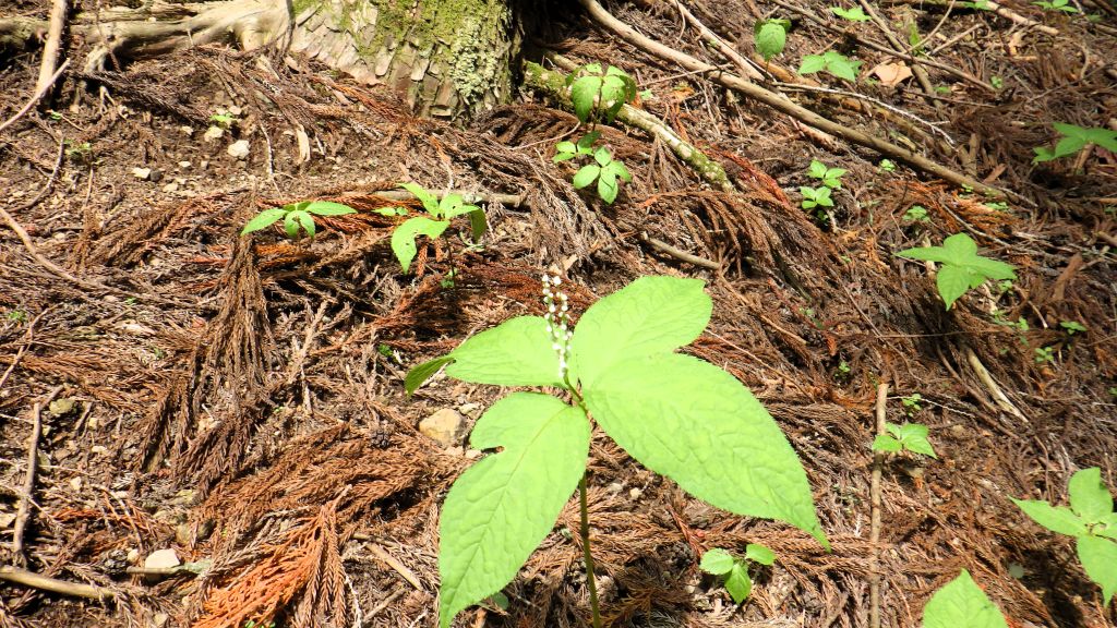 杉から檜の美林に代わり、穏やかな道が続いた。尾根に上がるとヤセて特に右側はストンと落ちている。ヤセ尾根は足場はしっかりして歩き易いが、急峻を避け左に九十九折の道は伸び足場は柔らかく不安定でした。頂上は狭く両神山をバックに立派な社が鎮座し一段下りた地点で昼食とした。