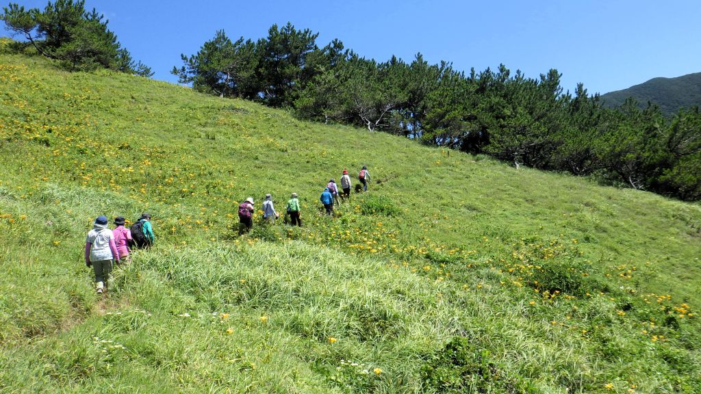 7/30 朝食7:00ホテル8:30尾岳登山口10:27尾岳11:23~43登山口12:28~41片野浦浜田13:30~14:04みっちり草原14:21~26浜田14:44ホテル16:20夕食18:00