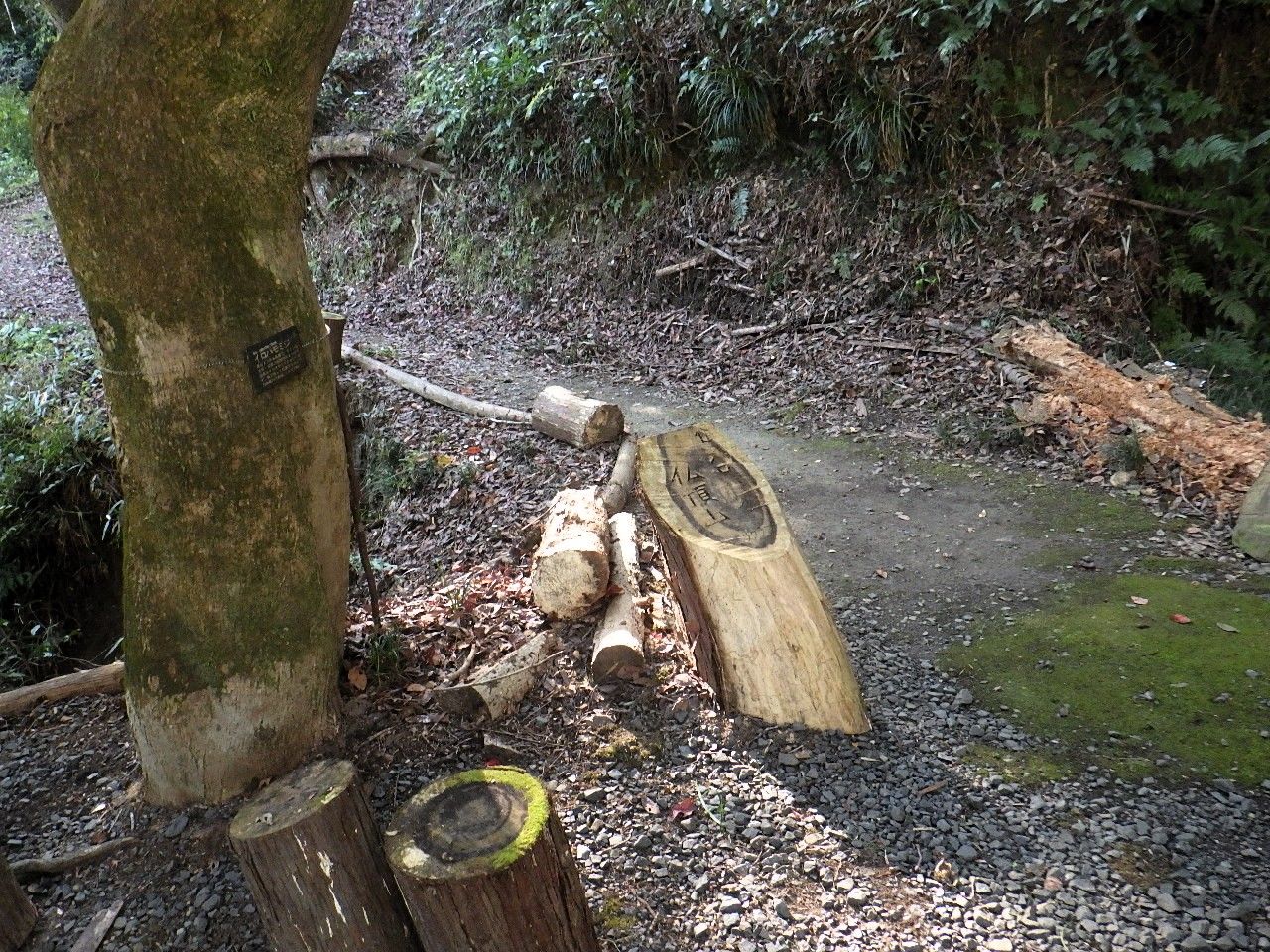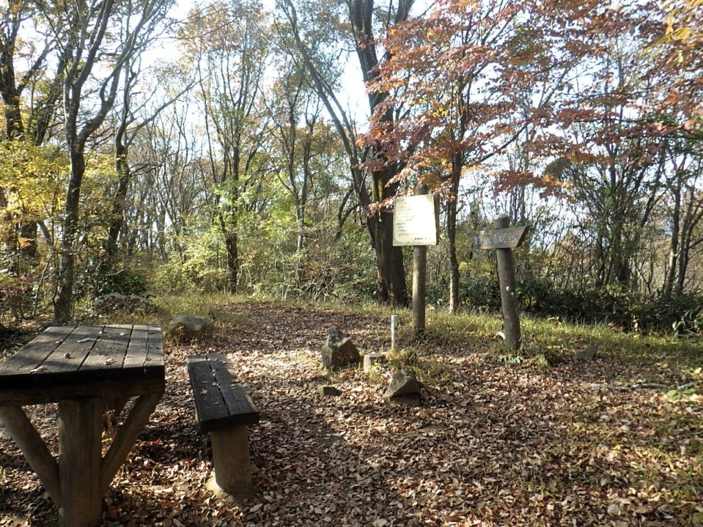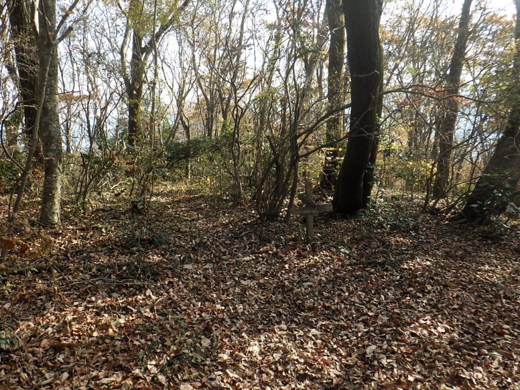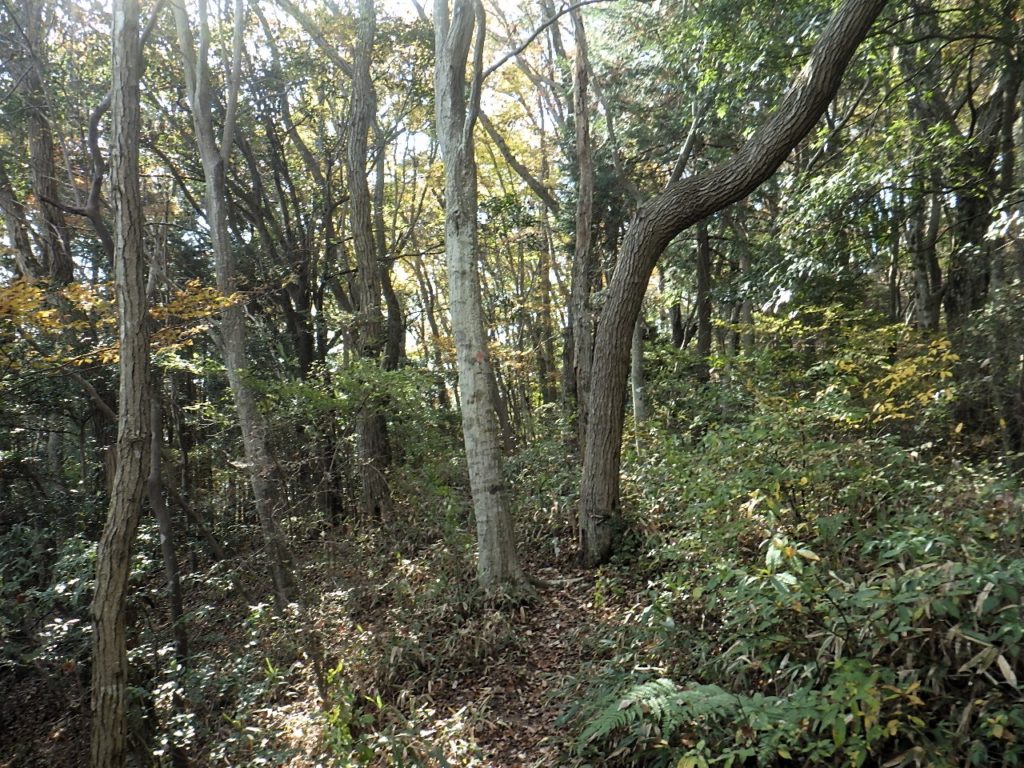 高峯へは穏やかなアップダウンで本日の最高峰。1分程歩くと車道への分岐、枯葉に微かな踏み跡が続く階段が無く急斜面は捕まる立木もなくゆっくり下る。